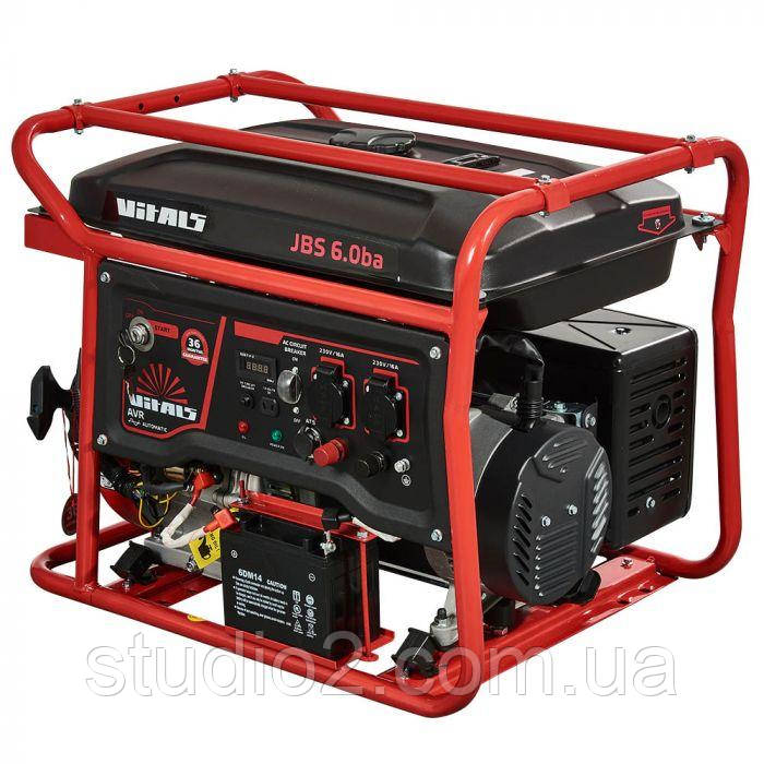 Бензиновий генератор Vitals JBS 6.0ba — це компактний переносний електричний агрегат, призначений для резервного або аварійного живлення побутових споживачів. Виробляє однофазний змінний струм напругою 230 В, частотою 50 Гц. Запуск генератора можливий у ручному або автоматичному режимі. Двигун У генераторі Vitals JBS 6.0ba застосований чотиритактний бензиновий двигун із верхнім розташуванням клапанів. Інноваційна конструкція кришки стартера і крильчатки охолодження запобігає перегріванню двигуна. Глушник промислового типу має посилене шумопоглинання, поліпшене відведення пари та гарячої води. Шум і вібрації під час роботи додатково гасять демпферні опори, якими двигун кріпиться до жорсткої металевої рами. Для зручності оператора генератор оснащений електричним стартером. Завдяки досконалій конструкції, високій якості виготовлення двигун характеризується економічністю і великим ресурсом напрацювання на відмову — понад 2000 мотогодин. Мінімальна витрата палива на вироблення 1 кВт∙год електроенергії становить 374 г. Захист від низького рівня мастила в картері двигуна Аварійна система захисту від низького рівня мастила в картері унеможливлює запуск двигуна без мастила або з недостатнім його рівнем. Це запобігає заклинювання рухомих частин і виходу з ладу двигуна. Заборонну команду система видає, отримавши відповідні дані від поплавцевого датчика в картері. Економічність Карбюратор у всіх режимах роботи готує оптимальну паливну суміш. Під час зміни навантаження положення дросельної заслінки регулюється автоматично. Збільшення і зменшення обертів відбувається плавно, без різких розгонів і гальмувань. Це сприяє економії палива. Найбільш економічно двигун працює на середньому навантаженні. Автоматичне введення резерву (ATS) Ніколи ще запуск генератора не був таким простим! Блок ATS автоматично запускає генератор і перемикає навантаження на нього під час вимикання основного джерела живлення й автоматично зупиняє роботу генератора в разі відновлення центрального електропостачання. Альтернатор зі 100% мідною обмоткою У генераторі Vitals JBS 6.0ba встановлений альтернатор синхронного типу. Він характеризується стабільними потужністю й напругою. Витримує великі (вище за номінальний) струми, що короткочасно виникають під час запуску реактивного навантаження, наприклад, електродвигуна. Тривалий термін служби вугільних щіток із підвищеним ресурсом робить непотрібною їхню часту заміну. Обмотки ротора і статора виготовлені зі 100% міді. Вони максимально надійні та витримують більш високу робочу температуру (проти алюмінієвих або з мідно-алюмінієвого сплаву). Поліпшена система охолодження забезпечує ефективне відведення тепла від обмоток і запобігає швидкому старінню ізоляції. Високоякісне складання та укладання обмоток гарантує тривалий термін служби й надійність генератора. Мініконтролер 3 в 1 Забезпечує контролювання 3 основних показників: напруги змінного струму; частоти струму; загальної кількості напрацьованих мотогодин. Силовий вивід генератора На додаток до двох розеток на 16 А генератор оснащений силовим виводом на 32 А. Це дає змогу використовувати агрегат на повну потужність у разі під’єднання одного потужного споживача. Автоматичний регулятор напруги (AVR) Автоматичний регулятор напруги гарантує стабільність вихідної 