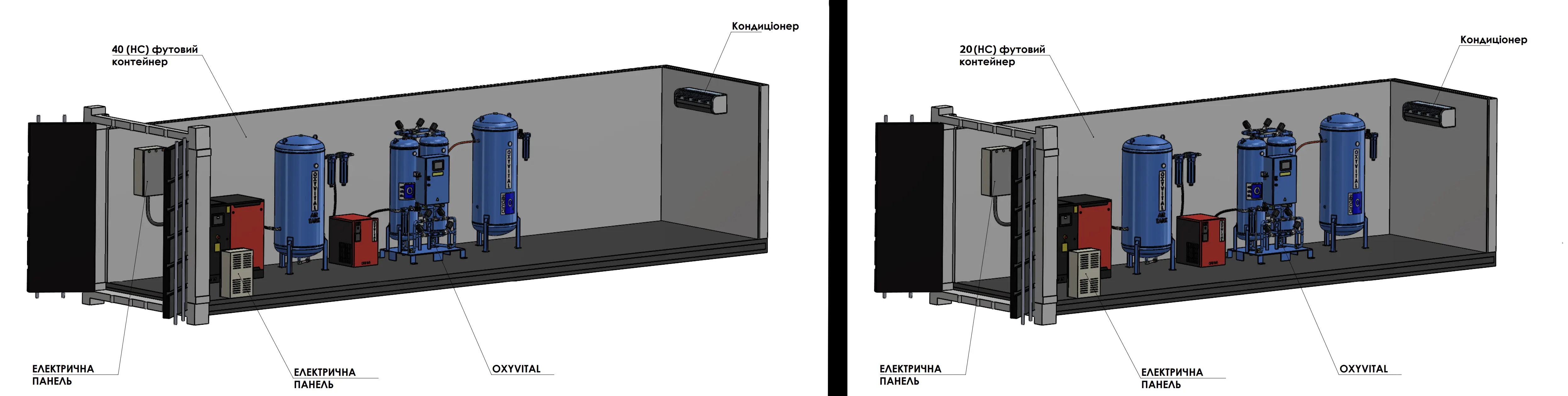 При відсутності капітальних будівель і приміщень, придатних для установки обладнання (компресорної) можливий варіант поставки обладнання в блочно-модульному машинному відділенні (контейнерне виконання) - 20-футовому адаптованому теплоізольованому контейнері. Блочно-модульне машинне відділення з встановленим обладнанням поставляється готовим до експлуатації. Для запуску обладнання в роботу необхідно підключення силового кабелю і підключення магістрального трубопроводу подачі кисню до споживачів.